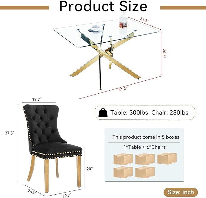 Goujxcy 51" Glass Dining Table Set for 6, Modern Kitchen Table and Chairs Set w/Steel Legs, 7-Piece Dining Table Set w/Glass Gold Dining Table and 6 Black Velvet Chairs for Kitchen Dining Room