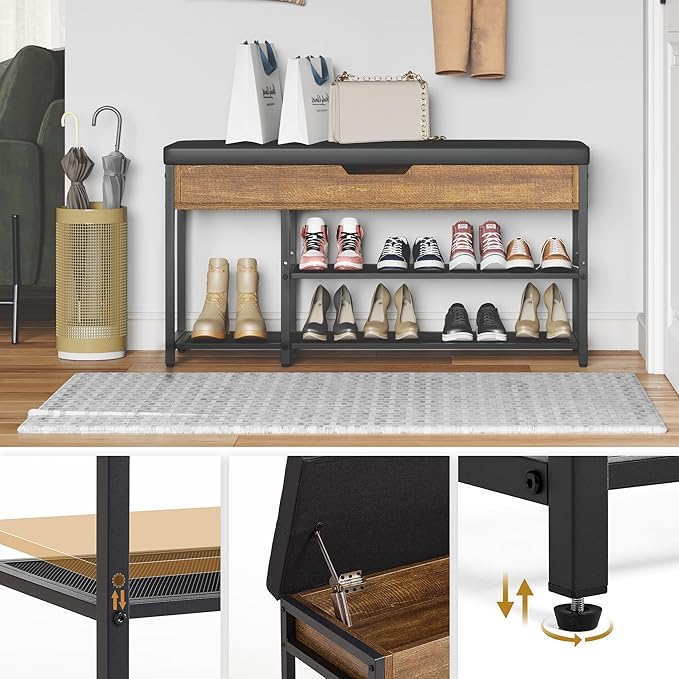 Shoe Rack Bench with Upholstered Cushion, Shoe Storage Bench with Adjustable Shelf and Hidden Storage Compartment for Hallway Entryway Living Room Rustic Brown (2-Tier)