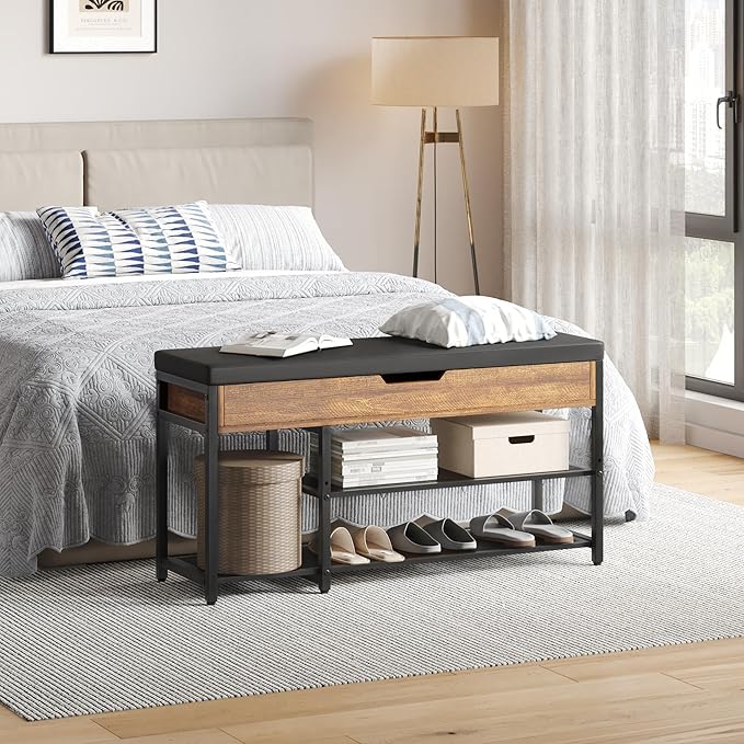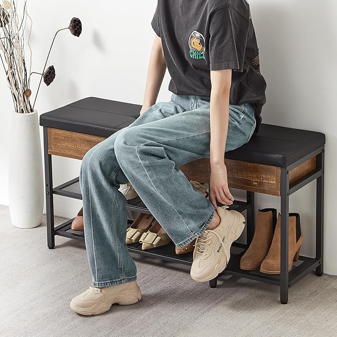 - [ Vintage Shoe Rack Bench ] - This shoe rack bench combines the faux leather, vintage wood elements, and a black metal frame, having enough support to keep it looking good while being soft and cozy.