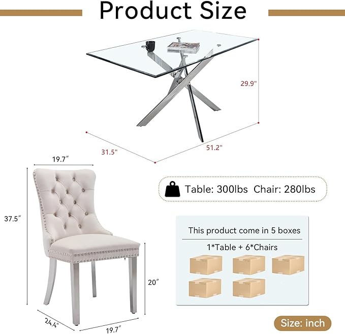 Goujxcy 51" Glass Dining Table Set for 6, Modern Kitchen Table and Chairs Set w/Steel Legs, 7-Piece Dining Table Set w/Glass Silver Dining Table and 6 Beige Velvet Chairs for Kitchen Dining Room