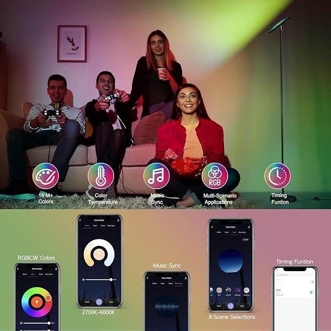 - Smart RGB LED Floor Lamp: SUNMORY floor lamps for living room has 16 million colors to switch at will, regular color temperature 3000K-6000K adjustable, with 3000LM super brightness in regular color temperature state, the brightness can be adjusted in the range of 1%-10%, which provides sufficient lighting for the living room or bedroom. The dimmable floor lamp has multiple scene atmosphere selection, timer and other functions, bringing you smart and easy life.