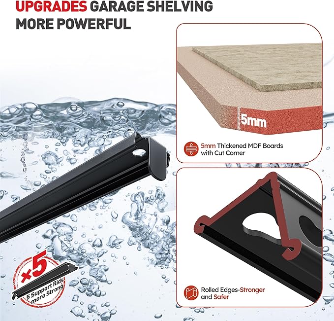 - 【Garage Shelving Heavy Duty Load 2020LBS】REIBII storage shelves feature rolled-edge thickened columns, each with support ribs. Made of high-quality metal frame and wood boards, each shelf holds up to 404 lbs, with a total capacity of 2020 lbs. The 5-tier design provides stable, solid storage for various items