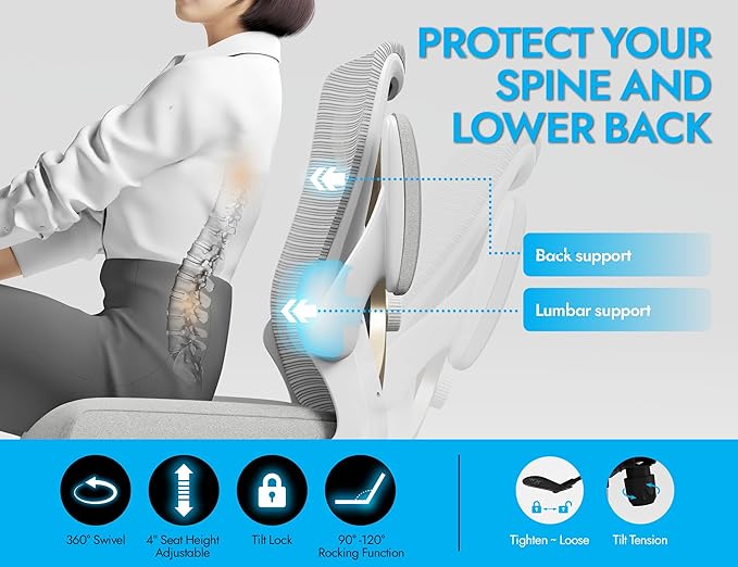- Comfortable Breathable Mesh Seat: This office chair offers a spacious seating area, accommodating various body types. Overall dimensions (including arms): 25.7" W x 17.3" D x 46.9.3"-49.2" H, Seat dimensions: 20" W x 17.3" D x 18.5"-3" H. It can support up to 330 lbs. Its unique recline function allows you to tilt the backrest (90~120°) or sit upright freely, ensuring your comfort and relaxation