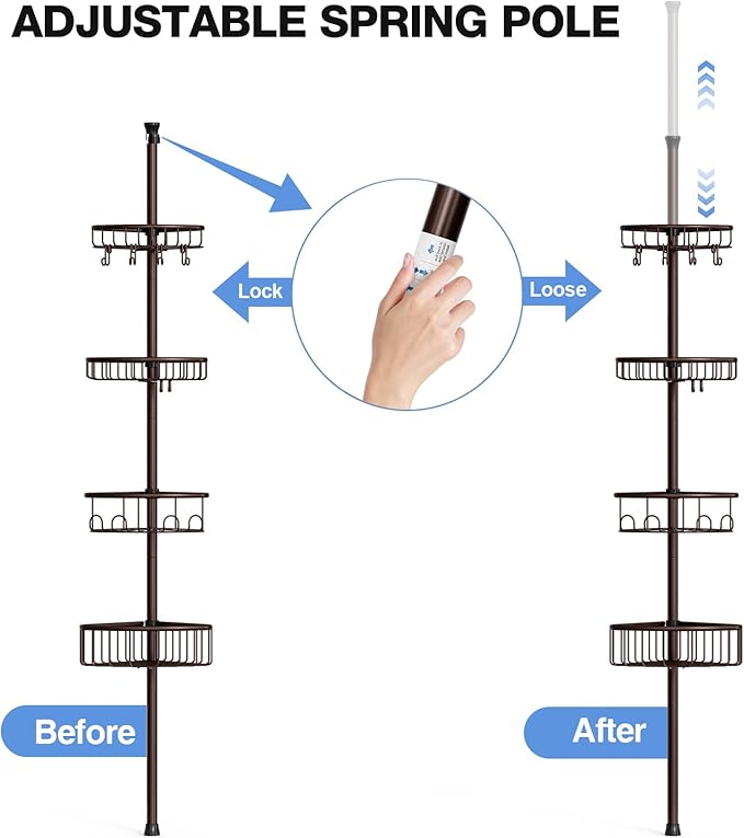 - Install in a Few Minutes: We provide detailed instructions, and it only takes a few minutes to install this rack. We use a clip design to easily adjust the height of the basket. Just a simple left and right rotation to adjust the secure buffer springs tension pole can easily customize the height for your bathroom