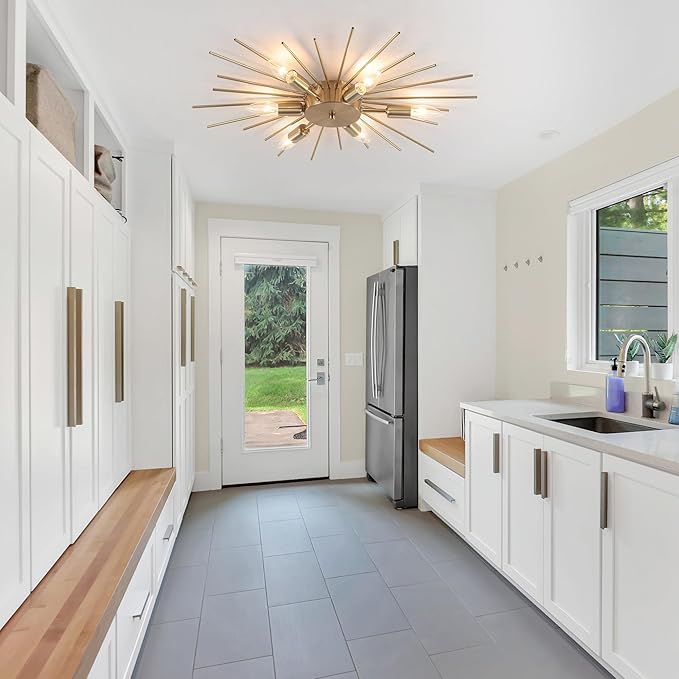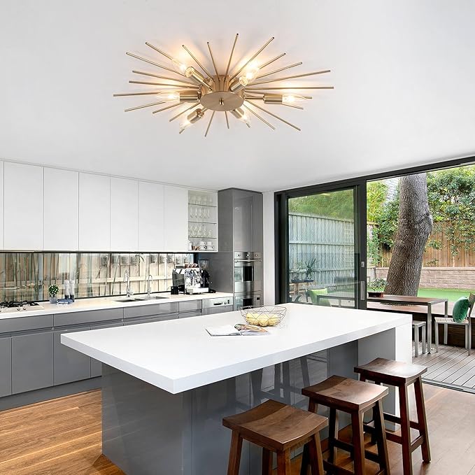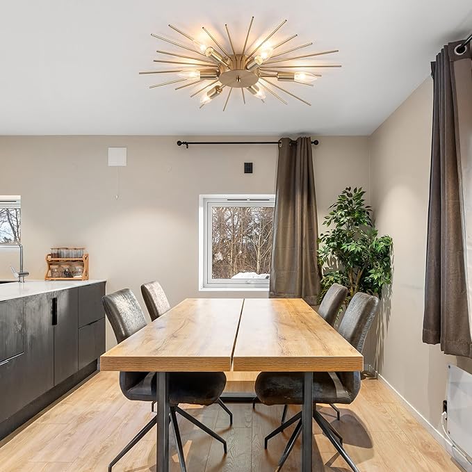 - Sputnik Ceiling light Design: This semi-flush mount chandelier ceiling light boasts an elegant and rustic design. The golden electroplate wrought aluminum rods provide a bright, eye-catching illumination that enhances the beauty and uniqueness of your home decor, not easy to fade, long-lasting brightness