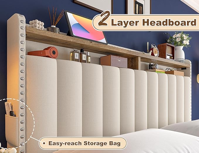 - 【Bedside Essentials Within Reach】 Say goodbye to cluttered nightstands and fumbling in the dark. The queen bed frame with innovative 2-tier headboard shelf keeps your phone, reading glasses, books, and nighttime essentials organized and accessible right where you need them. Wake up to a more serene, organized space every morning—it's like having a built-in nightstand that never gets messy.