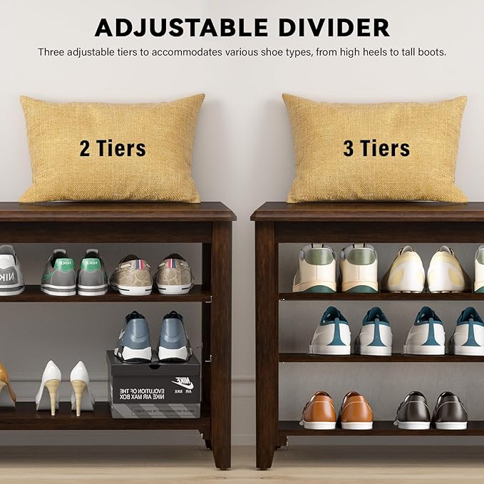 Shoe Bench Storage Rubberwood, Entryway Bench with 3-Tiers Height Adjustable, Shoe Rack Front Door Entrance Organizer for Hallway Living Room, Mudrooms, Walnut,23.6"