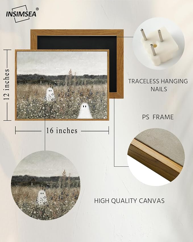 InSimSea Framed Canvas Prints Art Ghost Decor, Vintage Halloween Meadow with Flowers Painting, Spooky Gothic Decor, Rustic Landscape Pictures for Living Room, 12x16inch