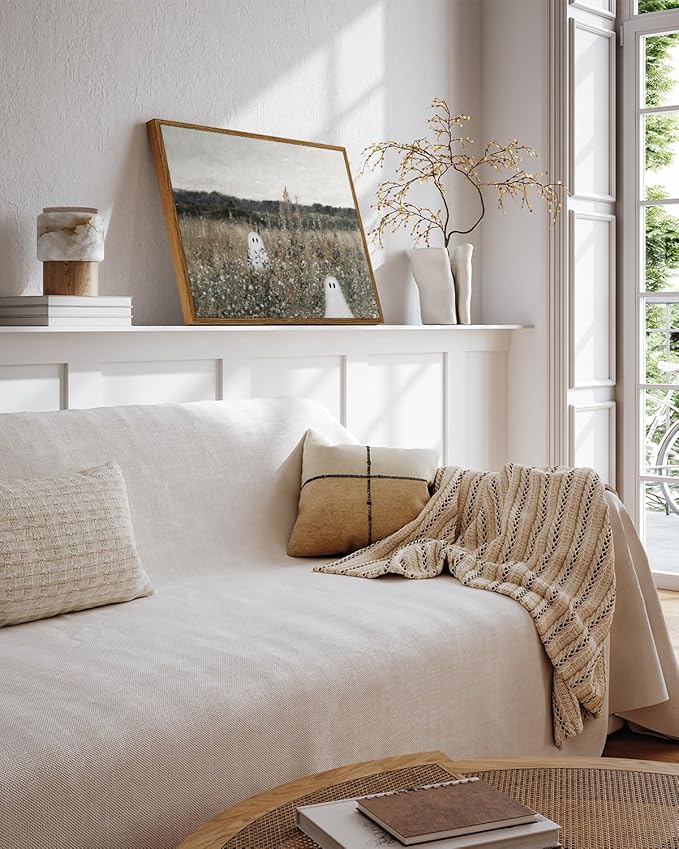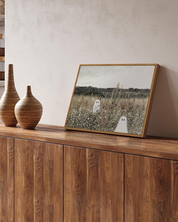 - Ghost Wall Art Decor: In a field of delicate wildflowers, two small ghostly figures with simple black eyes peer out from the tall grass, adding a playful and surreal touch to the otherwise serene landscape. The muted tones of the background blend seamlessly into the pale, cloudy sky, emphasizing the quiet atmosphere.