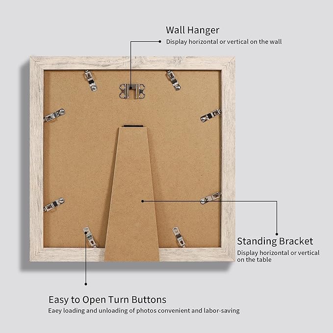 - EASY MOUNTING: The frames 10x10 come with 8 flexible swivel tabs on the back, Spring type action to remove the backing, without hurting fingers. Itβs easy to open and put in photos, so you interchange photos regularly with confidence.