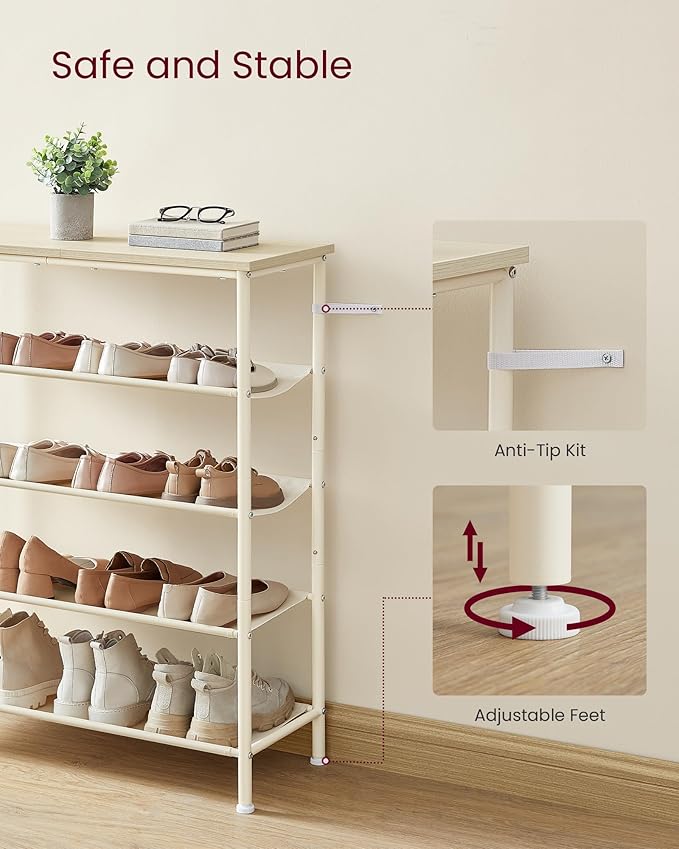 - [Sturdy and Stable] A sturdy steel frame, alongside adjustable feet, keeps the shoe rack balanced on uneven floors. The Max load ability of the top is 66 lb with each shelf bearing up to 22 lb. The included anti-tip kit secures it to the wall for added safety
