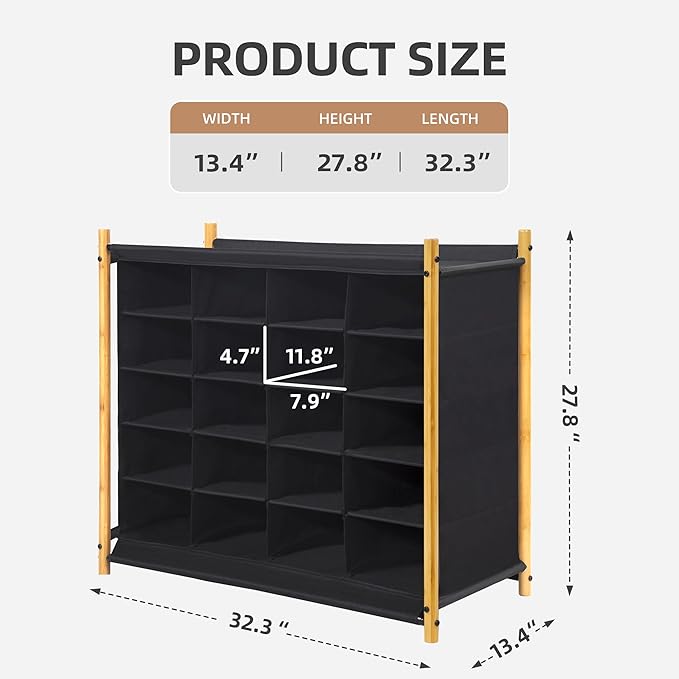 - Durable Bamboo Side Poles: The bamboo side poles provide sturdy support and a sleek, modern aesthetic, making this 20 cube shoe rack a stylish addition to any room.
