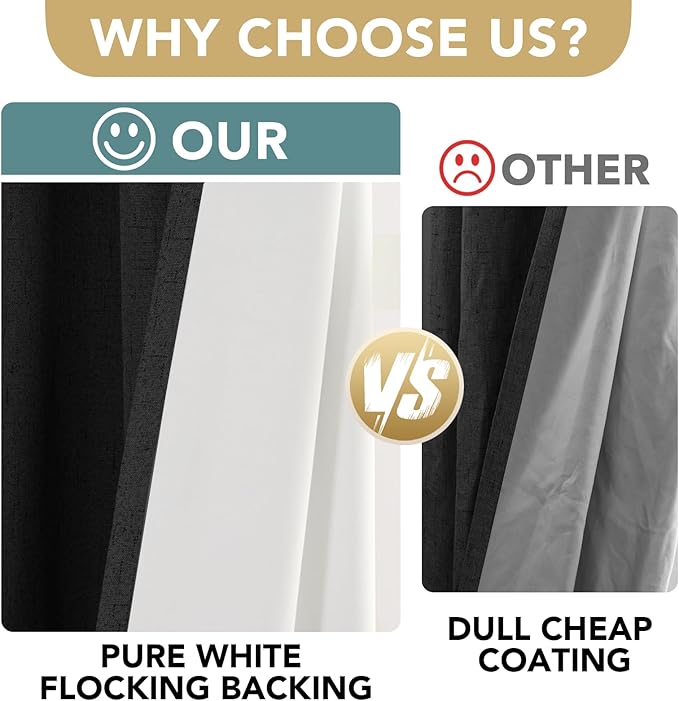 - 100% BLACKOUT: These elegant faux linen curtain is passed GLOBAL RECYCLED STANDARD certificate, has white color lining on backing, definitely can block out 100% bright sunlight and UV ray, turn day into night, just enjoy your sweet sleeping and protect your furniture from color fading, providing entire privacy in your place