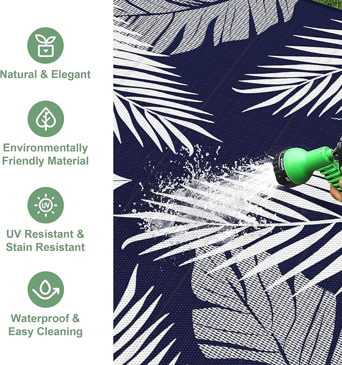 - Palm Leaf Design & Double-Sided Pattern: The sarben reversible outdoor rug boasts a striking double-sided pattern, showcasing a unique arrangement of multiple palm leaves. The two harmonious shades of blue and white blend seamlessly with nature, creating a cozy and inviting atmosphere. Both sides of the outdoor rugs are designed to look full and comfortable, enhancing the charm and elegance of your outdoor space