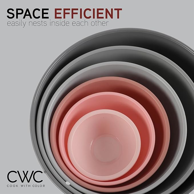 COOK WITH COLOR Mixing Bowls with Lids - 12 Piece Plastic Nesting Bowls Set includes 6 Prep Bowls and 6 Lids, Non Slip Bottom and Embossed Design - Microwave Safe (Pink)