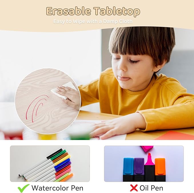 - 【THOUGHTFUL DESIGN】:The edge of this activity table is slightly raised to prevent the stationery from falling. The corners of the table are designed with arcs to reduce the damage to the baby due to bumps.