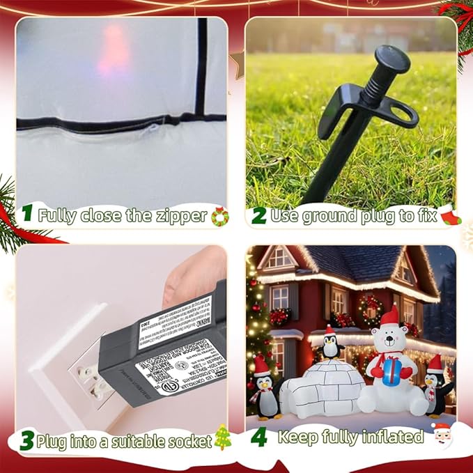- 【Self-Inflates & Easy to Store】 Equipped with a powerful blower, simply place the Christmas Inflatable Decoration on the ground and turn on the power, it can be quickly inflated in minutes. Secure it with 2 ropes 5 inserts and 2 moveable sandbags in the package. Storage is simple and compact. Just roll up the Christmas yard decorations and put it in the box for storage.