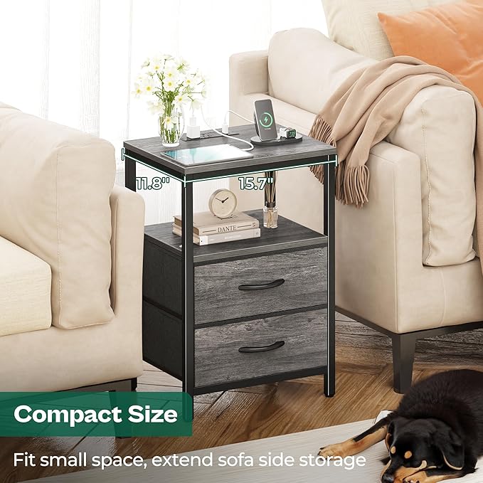 Huuger Nightstand with Charging Station, Fabric Drawers, End Table with Open Shelf, Bedside Table with USB Ports and Outlets, Night Stand for Bedroom, Gray