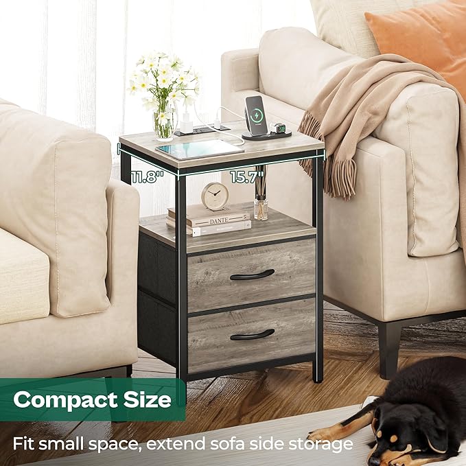 - 【Night Stand with Charger Station】Add 2 AC outlets, 1 USB port and 1 Type-C port, more charging spots for bedtime, plug in your phones and turn on your lamps, this nightstand with drawer will comfort your bedtime with convenient charging. Plus: Contain patent pending drawer slide