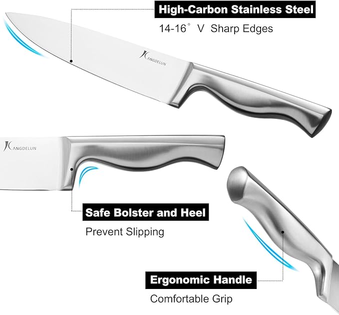 - SHARP AND STURDY: Made of ultra-sharp high carbon stainless steel, the blade is of high hardness of 58±2 HRC (Rockwell Hardness Scale) and better toughness, perfectly balancing hardness and toughness. Each blade is heat-treated and hand-polished to 14-16 degrees on each side. It is very sharp, and even after prolonged use the knife does not become dull or break easily. With a sharp blade, precise cutting ensures that the food retains its shape and flavor, and tastes even better.