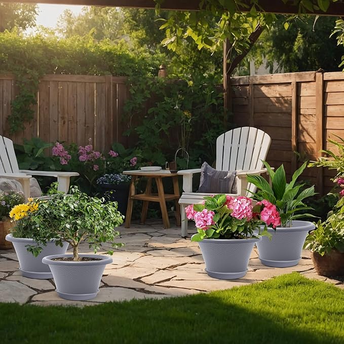 Quarut 12 Inch Large Planter Pot for Plants Indoor Outdoor, 4 Pack Plastic Flower Pots with Drainage Hole & Tray, Modern Decorative Garden Pot with Saucer, Plant Container for House Grey