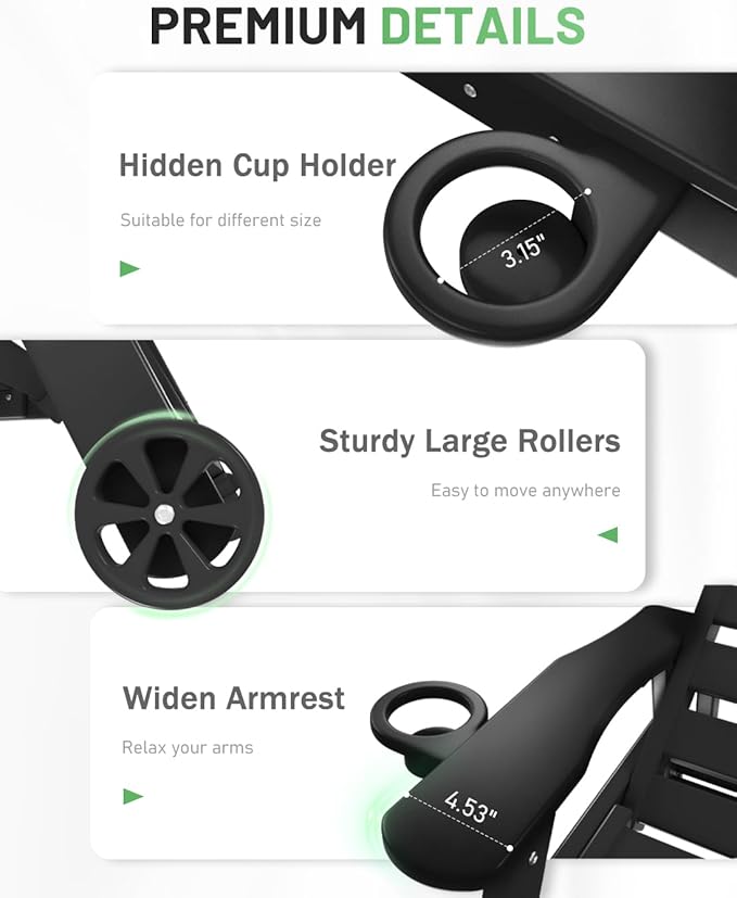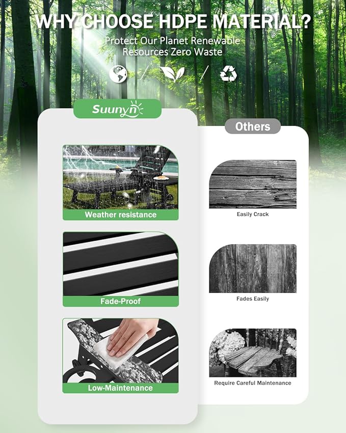 - Premium Suunyn HDPE: The polywood chaise lounge are made from high-density HDPE, which bends slightly under heavy weight or high temperature but returns to its original shape when the weight is removed or the temperature has dropped. This durable material withstands harsh weather and is easy to clean