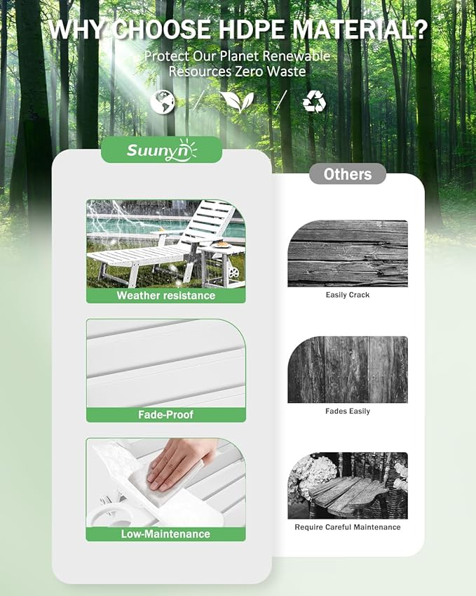 - Premium Suunyn HDPE: The polywood chaise lounge are made from high-density HDPE, which bends slightly under heavy weight or high temperature but returns to its original shape when the weight is removed or the temperature has dropped. This durable material withstands harsh weather and is easy to clean