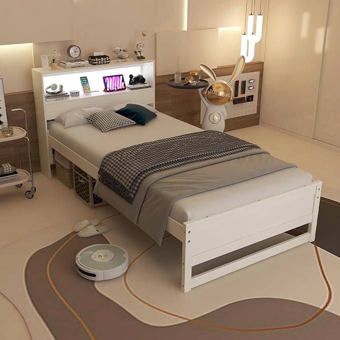KOMFOTT Twin Size Wood Platform Bed Frame with Charging Station & LED Light, Platform Bed with Storage Headboard & 12” Under-Bed Space, No Box Spring Needed Bed Base, Wood Mattress Foundation (White)