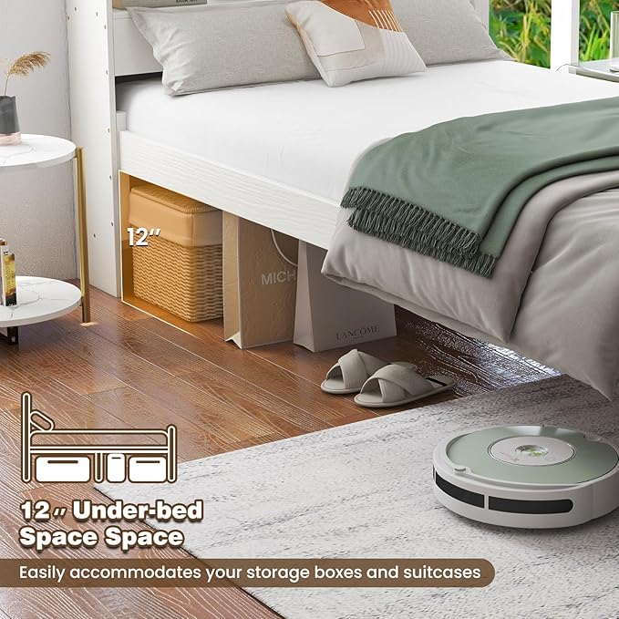 - 12” Under-bed Space: Utilize the 12” clearance under the twin bed, which easily accommodates your storage boxes and suitcases for an organized living space. This also allows for easy access to the sweeper, reducing time spent on chores.