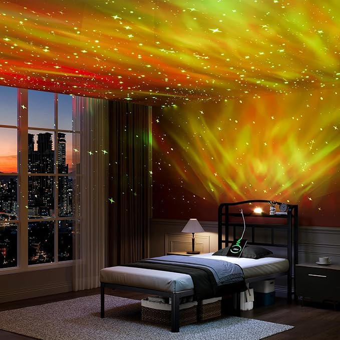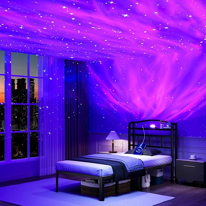 - TWIN SIZE BED FRAME GALAXY AURORA STAR PROJECTION: The headboard of our twin bed frame integrates a galaxy aurora projector, which boasts 3-projection lens that capable of projecting northern lights with 33 light effects and lively star light sky and 8 patterns, pre-loaded with 8 different white noises sounds to create a relaxing atmosphere with soothing music, bringing you to enjoy the beauty of nature and help you fall asleep easier.