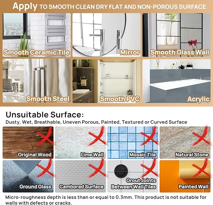 - Warm Tip: This shower organizer works best for non-porous, impervious, smooth surfaces such as glass, mirror, polished metal, stainless steel, plastic board, wall tile, grainy granite, etc. Please remind that don't stick to a grout line. If problems when firstly installation, please wash the suction cup, dry it with hair dryer and test it on the smooth glass surface. If suction holds, that means initial wall might not applicable for using suction cup, please change installation location.