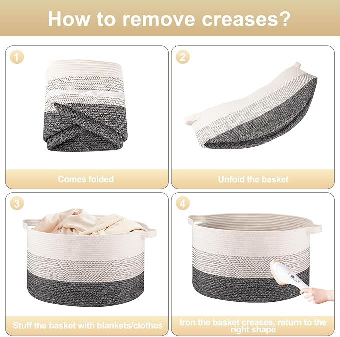 - Washable Large Basket: This big basket can be washed by hand or machine with gentle detergent. If machine washed, please put them into a laundry bag. NOTE: These cotton rope baskets are folded when shipping, but it will turn back to its elegant shape quickly if you fill it with some towels or clothing, and iron is great idea to remove the creases