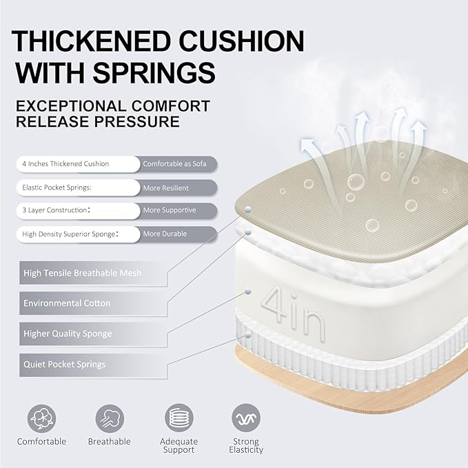 - Superior Cushioning: With a 4" extra-thick padded cushion made of high-quality supportive sponge and pocket springs, the chair provides ultimate comfort akin to a sofa, allowing you to work for extended periods without discomfort. The large 21.2" W x 20.5" D seat cushion accommodates different sitting positions.