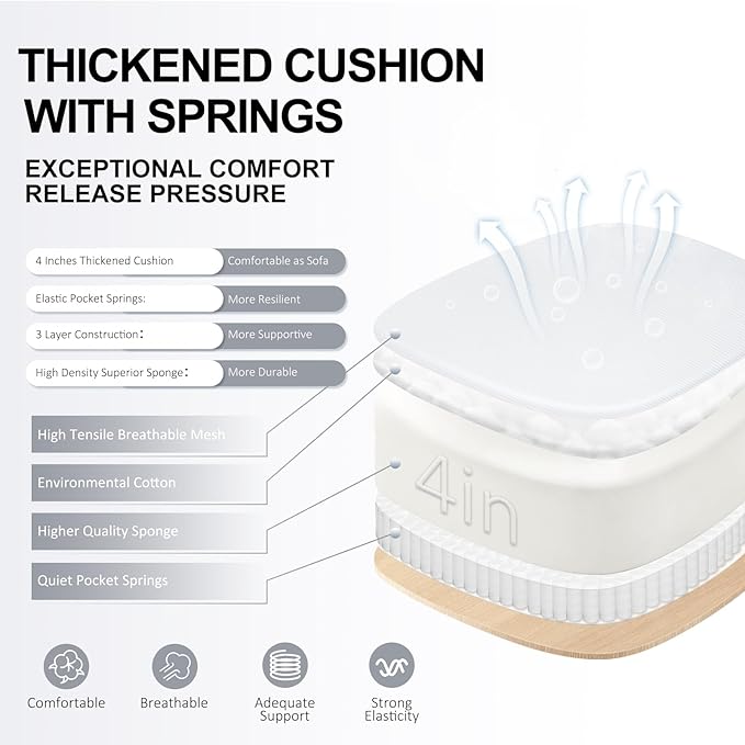 - Superior Cushioning: With a 4" extra-thick padded cushion made of high-quality supportive sponge and pocket springs, the chair provides ultimate comfort akin to a sofa, allowing you to work for extended periods without discomfort. The large 21.2" W x 20.5" D seat cushion accommodates different sitting positions.