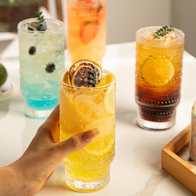 - Design Feature: This vintage glassware collection exudes a captivating charm with its intricately textured flower design, reminiscent of European retro styles. The delicate floral patterns in soft pastel hues add an air of elegance and uniqueness. The embossed design not only enhances the visual appeal but also provides a comfortable grip. It effortlessly matches any kind of tableware, making it a perfect addition to both casual and formal settings