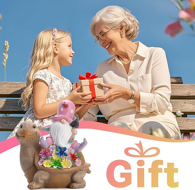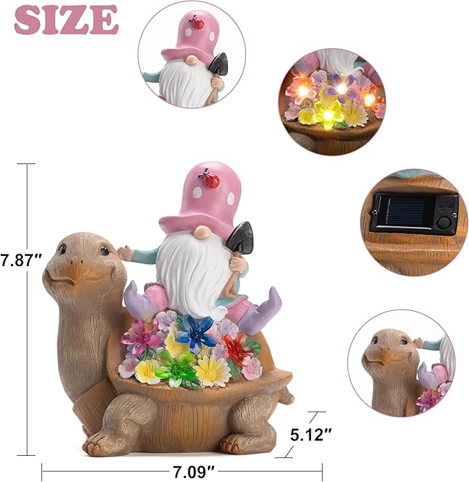 - Enchanting Garden Decoration – A whimsical turtle figurine carries a cheerful gnome amidst glowing LED blossoms, crafting a magical nighttime display. This artistic centerpiece elevates outdoor aesthetics, transforming gardens, patios, or lawns into captivating fairy-tale settings.