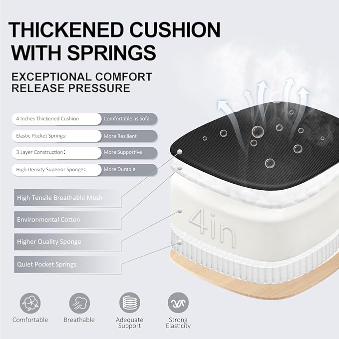 - Superior Cushioning: With a 4" extra-thick padded cushion made of high-quality supportive sponge and pocket springs, the chair provides ultimate comfort akin to a sofa, allowing you to work for extended periods without discomfort. The large 21.2" W x 20.5" D seat cushion accommodates different sitting positions.