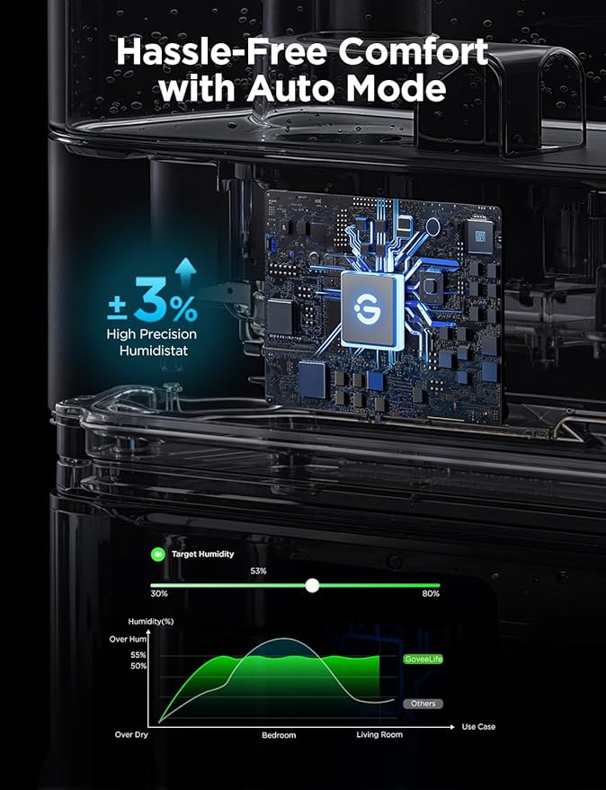 - Auto Mode: Features a built-in high-precision sensor, capable of adjusting humidity more accurately than other humidifiers, bringing humidification to the next level. Keep your home humidity balanced automatically with auto-mode. Pair with the GoveeLife Thermo-hygrometer for an expanded range (Thermo-hygrometer not included). Perfect humidifiers for bedroom and plants room.