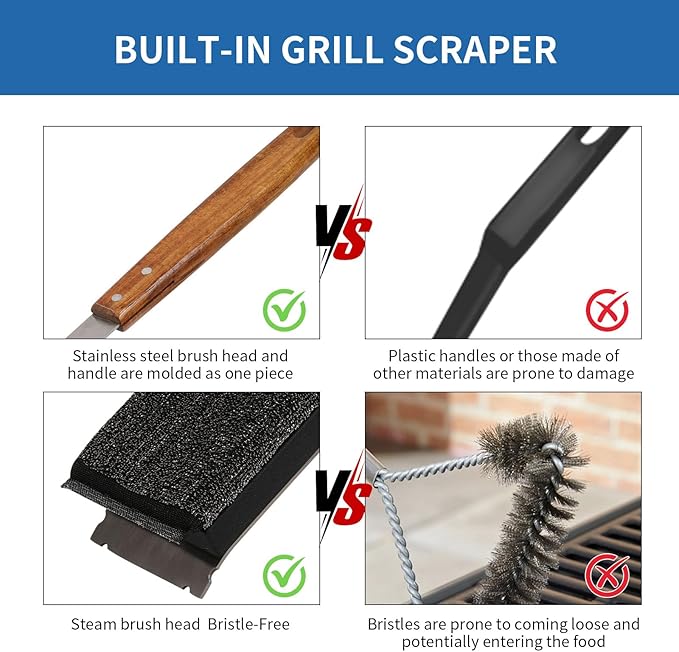 - 【100% Bristle-Free Safety Guarantee】 Unlike traditional wire brushes, our steam grill brush uses patented steel fiber technology to eliminate dangerous bristle shedding. Dipped in water, it generates instant steam to sanitize grates while keeping your food safe from contamination.