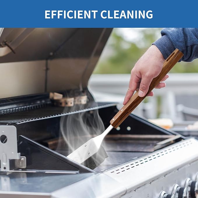 - 【Ergonomic & Heat-Protected Grip】 The extra-long stainless steel handle prevents bending, while the non-slip wooden grip keeps hands cool and safe from grill heat. Angled scraper effortlessly tackles edges and corners—no awkward wrist angles!