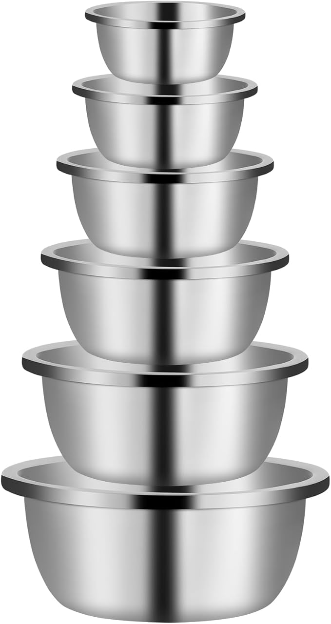 - Deepened Nesting Mixing Bowls:The stainless steel bowls set is deepened basin type ,6 mixing bowl set for mixing ingredients without any splashing, great for mixing eggs, stirring desserts, salads.