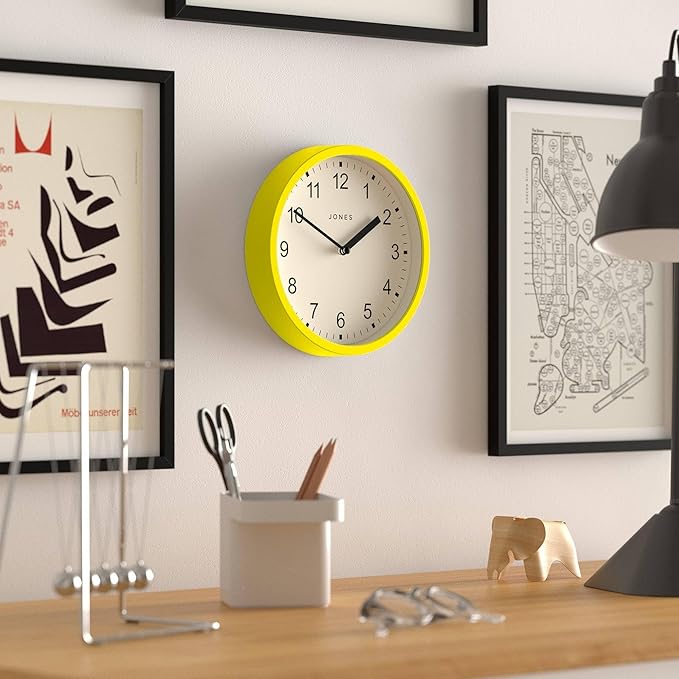 JONES CLOCKS® Spin Wall Clock | Small Modern Round Clock | 8inch | Yellow | Easy to Read Numbers | Ideal for Kitchen, Office, Children’s Room or Any Small Space