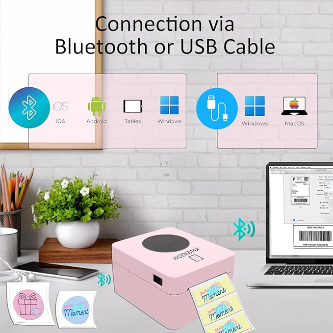 - Bluetooth & USB Shipping Label Printer: Simply download the App on smartphone for Bluetooth printing. With both Bluetooth and USB connectivity options, WODEMAX shipping label printer allows you to easily connect and print from your smartphone, tablet, or computer. Note: All devices cannot be directly connected to Bluetooth and need to be used through the app.