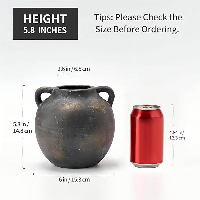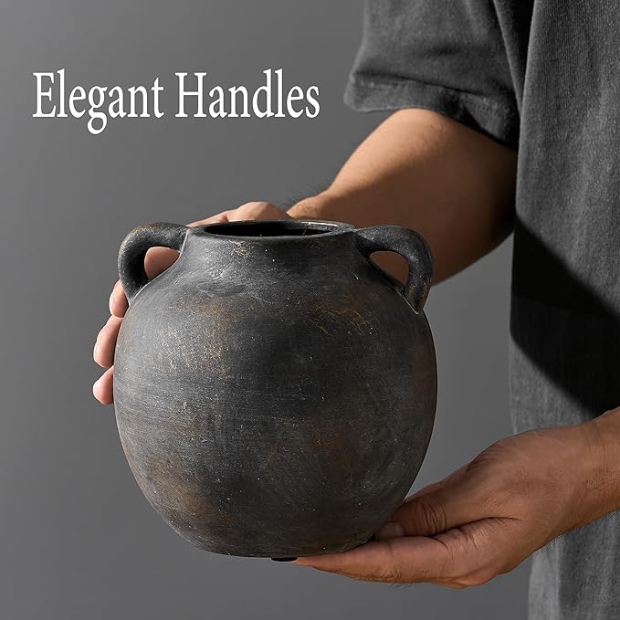 Ceramic Rustic Vase for Home Decor, 5.8 Inch Terracotta with Handles, Vintage Decorative for Flowers, Plants, Living Room, Table, Thanksgiving - Black Bronze