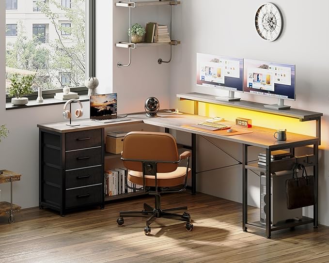 AODK 61" L Shaped Desk with Drawer, Computer Desk with Power Outlets & LED Lights, Reversible Corner Gaming Desks for Home Office Workstation, Office Table with Monitor Shelf, Gray