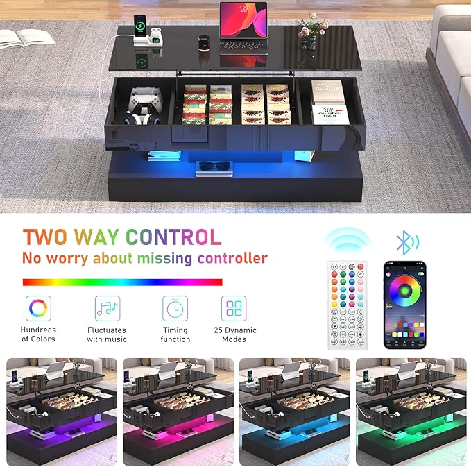 47.2" Large Lift Top Coffee Table,Modern High Glossy LED Coffee Tables for Living Room with Storage,Black Living Room Tables for Living Rooms,Dining Room,Bedroom Home Office,APP LED Lights(Black)