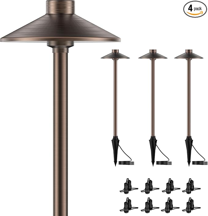 ZONEGRACE 4 Pack Solid Brass Low Voltage Pathway Lights,Outdoor Wired LED Landscape Path Lights,AC/DC 12V Bronze Pathway Lighting for Walkway Garden Yard,UL Listed Cord,Without Replacement Bulbs