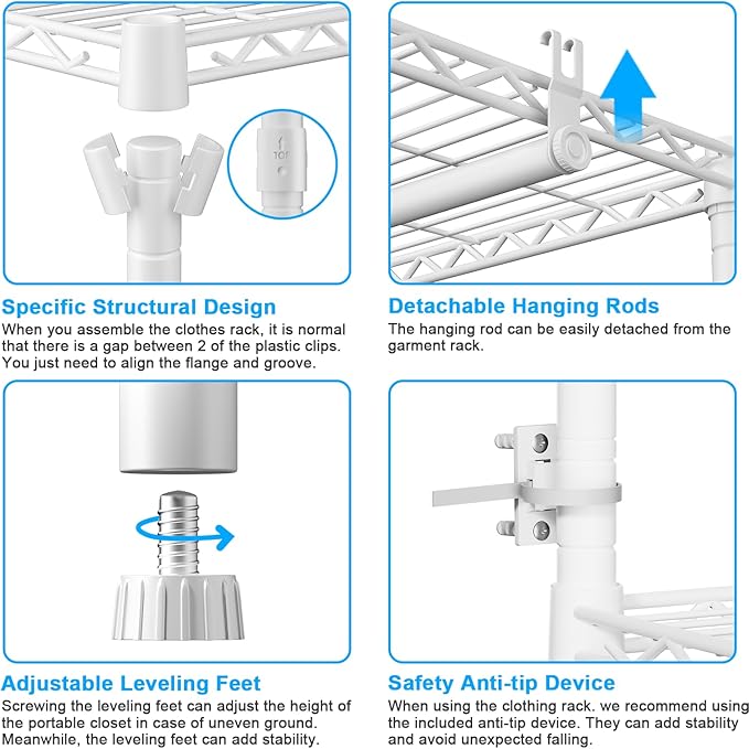 - ▶【STURDY & RELIABLE】Garment rack made of high quality carbon steel,Makes it stable、sturdy and reliable,Not easy to tip over,Portable closets for hanging clothes adopt non-polluting white coating to protect it from water and rust,Weight Capacity:Total 900lbs ,The middle shelf and 8 S hooks also enhances the stability of the closet organizer system when using!