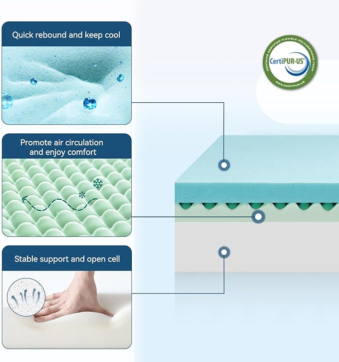 - 【Cooling&supportive】The mattress in a box features gel-infused memory foam, which responds to your pressure and cradles every curve of your body. Gel pods helps draw heat away to remain cooling during night. And Support Base Foam Layer is in high density to offer durability&stable support and designed with open-cell structure, it's promotes airflow to regulate temperate.