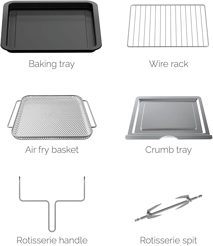 - 𝗥𝗢𝗧𝗜𝗦𝗦𝗘𝗥𝗜𝗘 & 𝗗𝗘𝗛𝗬𝗗𝗥𝗔𝗧𝗘: The included rotisserie set and dehydration feature offer even more versatility. Use this oven toaster air fryer combination to slow-roast meats or preserve snacks with up to 8 hours of low-temp drying. A standout among air fryer ovens countertop models.